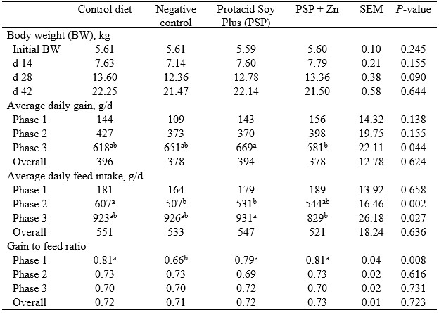 - Overall growth performance did not differ among treatments, indicating the inclusion of PSP or PSP + Zn did not affect the growth performance over the 6-week period even as enzyme treated soybean meal was reduced in diets.