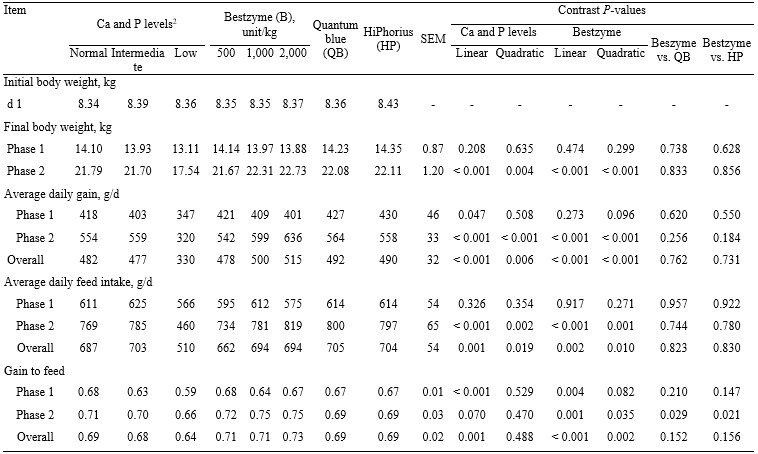 In phase 1, final BW and ADFI were not affected by using Bestzyme supplementation, but G:F was increased (linear; P < 0.05) and ADG tended to be increased (quadratic; P < 0.10) as Bestzyme increased in diets containing low Ca and P. During phase 2 and for the overall experimental period, final BW, ADG, ADFI, and G:F were increased (quadratic; P < 0.05) by increasing Bestzyme.