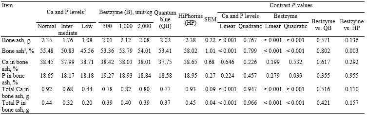 Bone ash weight and concentration of ash in dried and defatted metatarsals were reduced (linear; P < 0.05) as dietary Ca and P were reduced from normal to intermediate and low (Table 2). Likewise, concentrations of total Ca and P in bone ash were reduced (linear; P < 0.05) as dietary Ca and P were reduced. Bone ash weight and concentration of ash in dried and defatted metatarsals increased (quadratic; P < 0.05) as Bestzyme increased in diets containing low Ca and P. Concentrations of total Ca and P in bone ash also increased (quadratic; P < 0.05) by increasing Bestzyme in the diet containing low Ca and P. There were no differences in the bone ash weight and concentrations of total Ca and P in bone ash between pigs fed diets containing 1,000 units of Bestzyme and pigs fed 1,000 units of Quantum blue or between 1,000 units of Bestzyme and 1,000 units of HiPhorius. However, pigs fed the diet containing 1,000 units of HiPhorius had a greater (P < 0.05) concentration of ash in the metatarsal than pigs fed the diet with 1,000 units of Bestzyme. There were no differences in the concentration of ash (%) in the metatarsal of pigs fed diets containing 1,000 units of Bestzyme or Quantum blue.