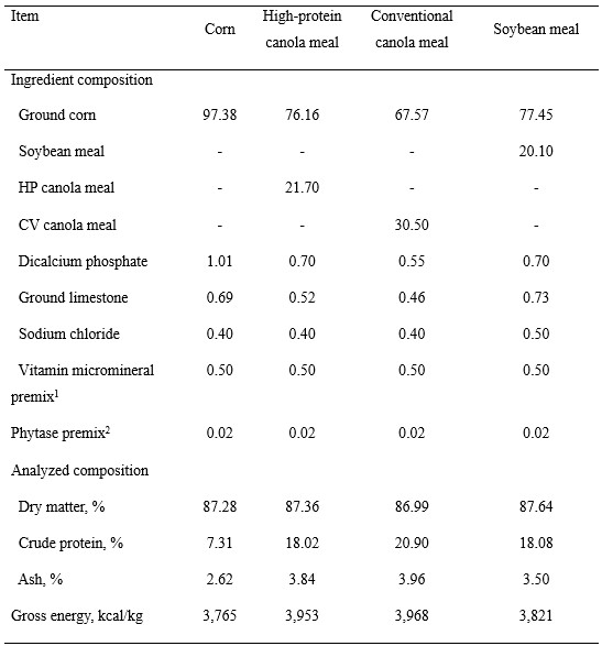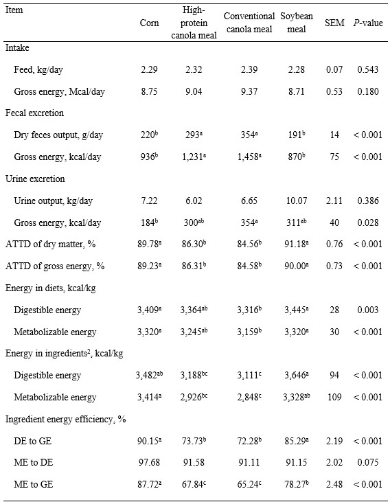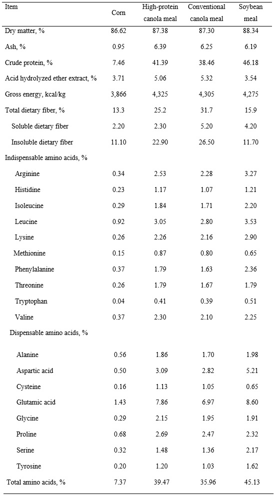 All animals remained healthy throughout the experiment and readily consumed their assigned diets. The ATTD of dry matter and gross energy were not different between diets containing CM-HP and CM-CV, but the corn diet and the corn-SBM diet had ATTD of dry matter and gross energy that were greater (P < 0.05) than in the two canola meal diets.