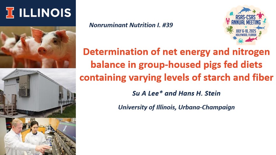Dr. Su A Lee, Research Scientist in the Stein Monogastric Nutrition Lab, discusses the Determination of net energy and nitrogen balance in group-housed pigs fed diets containing varying levels of starch and fiber. Adapted from a presentation at the 2025 ASAS-CSAS Annual Meeting, July 6 - 10, 2025.