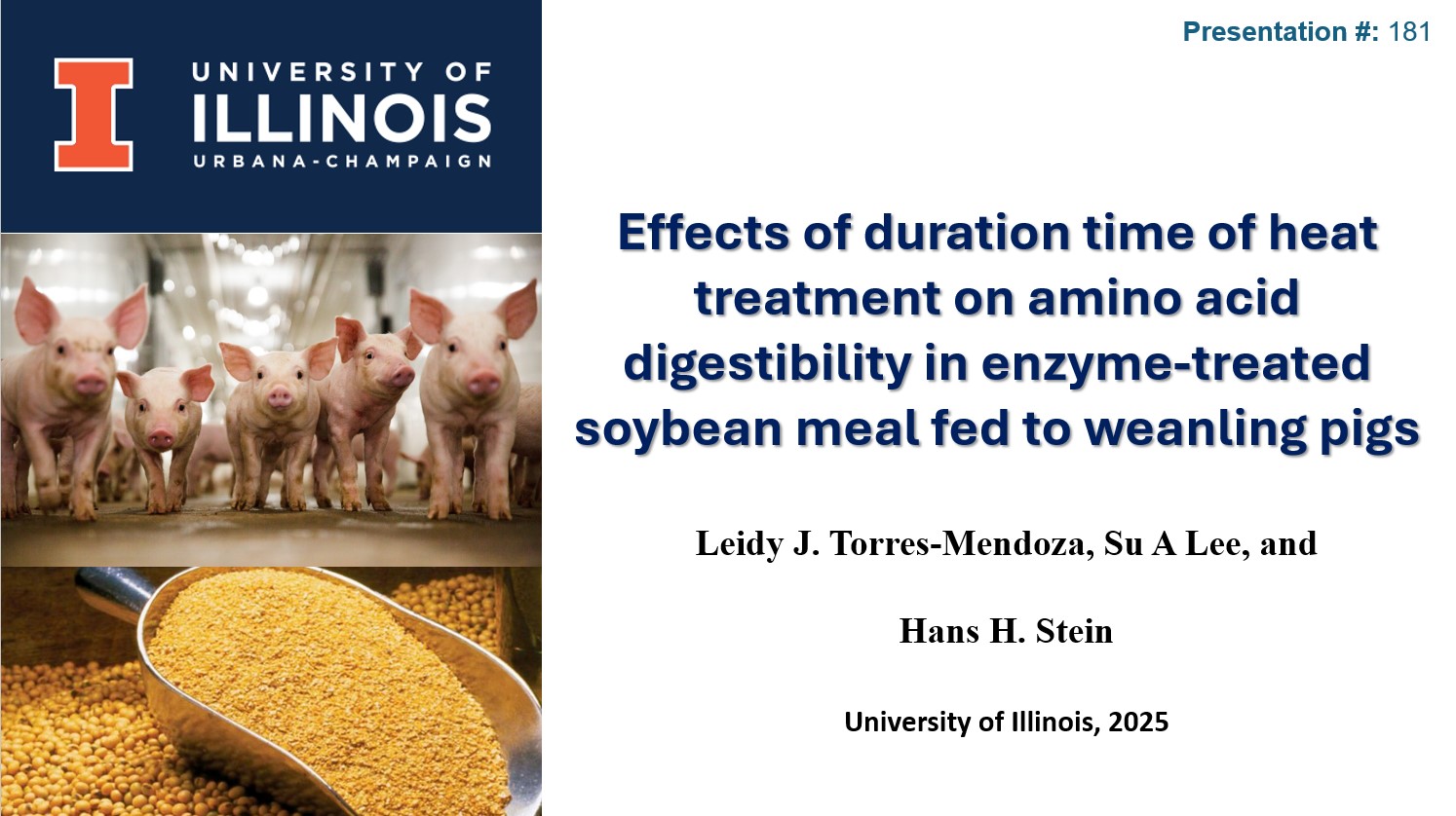 Leidy Torres, Ph D. Candidate in the Stein Monogastric Nutrition Lab, discusses the effects of duration time of heat treatment on amino acid digestibility in enzyme-treated soybean meal fed to weanling pigs. Adapted from a presentation at the 2025 ASAS Midwest Section meeting, March 10-12, 2025.